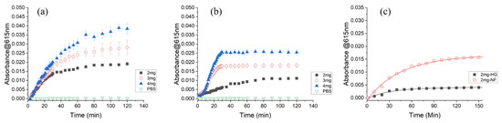 Kinetics of the reaction of X-Gluc grafted PUAA-ADH with ß-GUS followed at a wavelength of 615 nm, (a) varying the substrate concentrations (using 2 mg, 4 mg, 8 mg of the 40 µm cuboid hydrogel films, 50 nM ß-GUS); (b) varying the β-GUS concentration (25 nM, 35 nM, 50 nM and 100 nM for a 40 µm cuboid hydrogel film (error bars: standard error of the mean, n = 3).