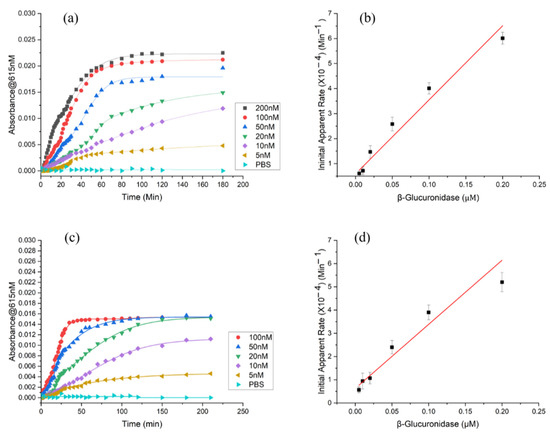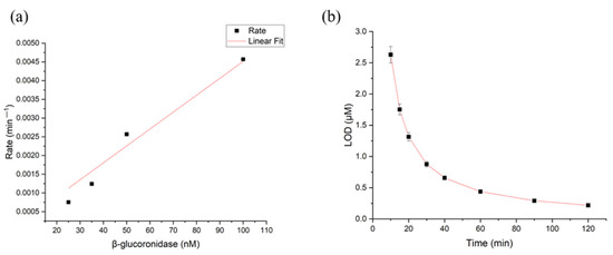 Similarly, the LOD of β-glucuronidase for PUAA micro-cuboid structured films was determined. The initial apparent rates of reaction were plotted against the initial concentrations of the enzyme. The initial apparent rate of reaction was found to be 4.5 ± 2.9 min−1 nM−1 and depended linearly on the initial enzyme concentration. The rate constant was obtained from the slope in Figure 11a and observation time was chosen arbitrarily.