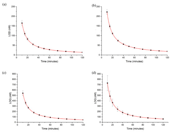 The limit of detection (LOD) for β-glucuronidase sensing CS/PEO NFs (a) and CS/PEO HG’s (b) and the limit of quantification (LOQ) for CS/PEO NFs (c) and CS/PEO HG’s (d).