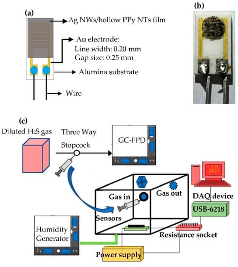 The gas-sensing and electrical properties of the H2S gas sensors made of Ag NW/hollow PPy NT nanocomposite films were measured at room temperature using a bench system, as shown in Figure 1c. The free volume of the bench chamber was 24 L. Firstly, each gas sensor was connected to a load resistor. A fixed 5 V was supplied to the sensor circuit using a power supply. Then, the voltage of each testing gas sensor at the end of the load resistor was measured using a DAQ device (NI, USB-6218). Finally, the resistance of each testing H2S gas sensor was calculated according to the as-measured voltage. The desired H2S gas concentrations were produced by a two-step dilution process using dry air. First, the 1000 ppm standard H2S gas was diluted to 1 ppm. Then, the 1 ppm H2S was further diluted to the desired H2S gas concentrations. Finally, the required H2S gas concentrations were analyzed by using a gas chromatograph (GC, TRACE 1300, Thermo, Waltham, MA, USA) equipped with a flame photometric detector (FPD). The relative uncertainty for the preparing H2S gas that ranged from 10 to 1000 ppb was 12%. The required interfering gas concentrations were confirmed by a calibrated gas sensor system (Dräger X-am 5000 with a resolution of 0.1 ppm). The principal apparatus for controlling the generation of humidity was a divided humidity generator, in which the proportion of dry and humid air under a total flow rate was 10 L/min to obtain the required humidity conditions for humidity testing. The model of the two mass flow controllers (Hastings) and flow display power supply used was the Protec PC-540 manufactured by Sierra Instruments Inc. The relative humidity (RH) values were measured using a calibrated hygrometer (Rotronic) with an accuracy of ±0.1% RH. When the bench system obtained the desired RH values, it stopped supplying humidity and then injected the desired H2S gas into the system. All experiments were studied at room temperature (25 ± 1 °C) and 40% RH, except for the testing of the effect of the ambient humidity on the sensor. The sensor response (S) was defined by Equation (1):