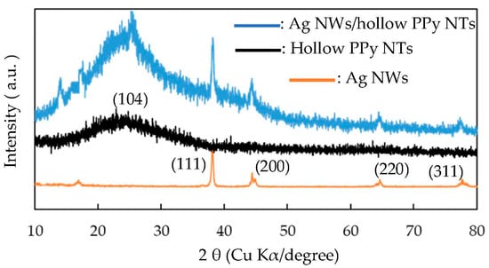 Figure 2 presents the XRD spectra of the pristine Ag NWs, pristine hollow PPy NTs and Ag NW/hollow PPy NT nanocomposite. XRD patterns of pristine Ag NWs had four sharp diffraction peaks at 2θ = 38°, 44°, 64° and 77°, conforming to the (111), (200), (220) and (311) planes of Ag and showing the face-centered cubic (FCC) structure of Ag [39]. XRD patterns of pristine hollow PPy NTs showed a broad peak at 24° because of the scattering from PPy chains at the interplanar spacing and the formation of amorphous PPy [40,41,42]. XRD patterns of the Ag NW/hollow PPy NT nanocomposite had the main characteristic peaks of Ag NWs and hollow PPy NTs, revealing the existence of Ag NWs and hollow PPy NTs in the nanocomposites.