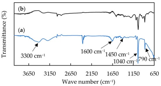 Figure 3 presents the IR spectra of the pristine hollow PPy NTs and Ag NW/hollow PPy NT nanocomposite. For IR spectrum of pristine hollow PPy NTs (Figure 3a), the N-H stretching, C=C stretching, C-N stretching, N-H bands and C–H wagging of PPy conformed to 3300, 1600, 1450, 1040 and 790 cm−1 were observed [43,44]. The IR spectrum of the Ag NW/hollow PPy NT nanocomposite had the same main characteristic absorption peaks of the pristine hollow PPy NTs, indicating that there was no interaction between the Ag NWs and hollow PPy NTs during the blending process.
