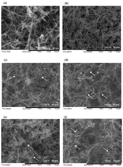 Figure 4 presents the SEM images of the pristine hollow PPy NTs, pristine Ag NWs and Ag NW/hollow PPy NT nanocomposites. Figure 4a reveals that the pristine hollow PPy NTs had irregular synapses with a branching structure where the lengths of the tubes were in the range of 3~5 µm. Figure 4a reveals that the pristine Ag NWs had a highly ordered wire structure where their lengths were in the range of 2.5~5.5 µm. Figure 4c–g show the SEM images of the Ag NW/hollow PPy NT nanocomposites with varying weight percentages of the added Ag NWs ranging from 0.3 wt% to 25 wt%. As the added amount of Ag NWs was increased, obvious and homogeneously dispersed Ag NWs in the Ag NW/hollow PPy NT nanocomposites were observed. Additionally, the Ag NWs physically contacted the hollow PPy NTs in the Ag NW/hollow PPy NT nanocomposites. However, when the amount of added Ag NWs was upped to 25 wt%, aggregated Ag NWs were observed.