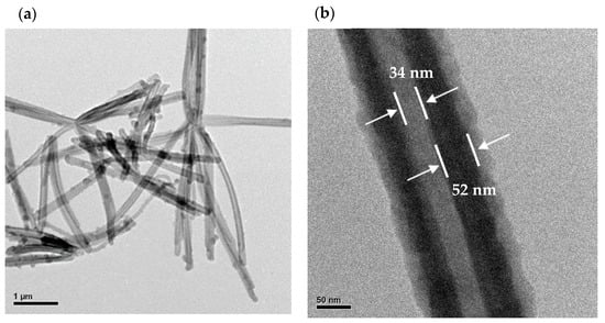 Figure 5 shows the TEM images of the pristine of PPy NTs and Ag NWs. The low-magnification TEM image of the pristine hollow PPy NTs (Figure 5a) shows that the size and shape of hollow PPy NTs are like the observations from the SEM. The higher-magnification TEM image of the selected area in Figure 5a shows that the PPy NTs had a hollow structure where the wall thickness of the tube and inner diameter of the hollow PPy NTs were about 52 nm and 34 nm, respectively (Figure 5b). The low-magnification TEM image of the pristine Ag NWs (Figure 5c) clearly shows the perfect straightness of the nanowires along the longitudinal axis. The higher-magnification TEM image of the Ag NWs shows that the diameter of the Ag NWs was about 58 nm (Figure 5d). The high-resolution TEM (HRTEM) image of the Ag NWs shows that the fringe spacings of 0.237 nm agree with the (111) crystal plane of FCC Ag (Figure 5e). The SAED pattern (inset in Figure 5e) represents a complex crystalline structure of different facets for the FCC Ag, revealing that each Ag NW was not a single crystal because the pattern contains an interpenetrated set of two individual diffraction patterns and the diffraction spots cannot be assigned to any simple pattern associated with FCC Ag [45]. Elemental analysis (Figure 5f) and EDX elemental mapping (Figure 5g) suggested that the presence of Ag was only in the composition of the Ag NWs. Moreover, the results of Figure 5d,g (as shown with white arrows) indicate the presence of Ag nanoparticles on top of the Ag NWs.