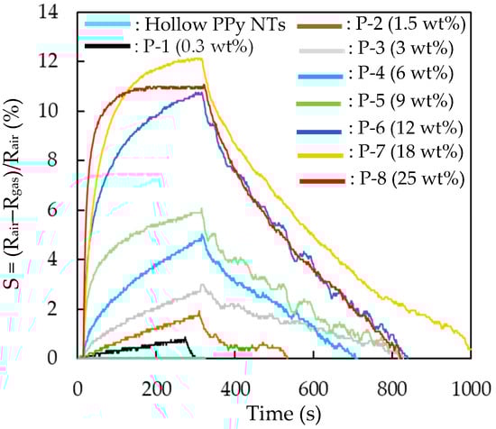 The response (S) of the H2S gas sensor that was made of pristine hollow PPy NTs was only 0.02, even upon exposure to a high H2S testing concentration of 10 ppm. To improve the response (S) of the H2S gas sensor that was made of pristine hollow PPy NT film for sensing ppb-level H2S gas at room temperature, the film was modified with Ag NWs. Figure 6 plots the effect of the amount of Ag NWs blended to modify the film on the response (S) of the H2S gas sensors, based on the Ag NW/hollow PPy NT nanocomposite films exposing to 500 ppb H2S at room temperature. The response (S) of the H2S gas sensors made of Ag NW/hollow PPy NT nanocomposite films increased by increasing the concentration of blended Ag NWs up to 18 wt% (P-7). These results were due to the fact that the higher concentration of blended Ag NWs can increase the surface reaction sites and improve the conductivity of the Ag NW/hollow PPy NT nanocomposite film (based on the results of SEM, Figure 4c–f) [12,46], promoting the catalytic activity of the sensor. However, when the concentration of blended Ag NWs increased to 25 wt% (P-8), the response (S) decreased because of the decrease in the number of active sites due to the agglomeration of Ag NWs [46]. The response (S) of the H2S gas sensor that was made of the Ag NW/hollow PPy NT nanocomposite film (P-7) to 500 ppb H2S exhibited the strongest response (S) (a little over 12%) and best long-term stability at room temperature, and was therefore tested further to evaluate its other gas-sensing properties.