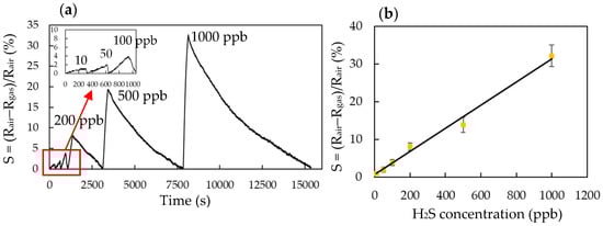Figure 7a plots the dynamic responses (S) of the H2S gas sensor (P-7) toward H2S ranging from 10 to 1000 ppb at the exposure time of 120 s, at room temperature and at 40% RH. It had a response (S) of 1% even to 10 ppb H2S (as shown in inset). Figure 7b presents the response (S) of the H2S gas sensor (P-7) when the H2S gas ranged from 10 to 1000 ppb at room temperature and at 40% RH. The linear fitting curve equation for the H2S gas sensor (P-7) was Y = 0.0308X + 0.6279; R2 = 0.9897. The limit of detection (LOD) that was calculated at the calibration point of 10 ppb by considering a S/N of 3 was 4.5 ppb.