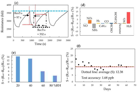 Figure 7. (a) Response (S) of the H2S sensor (P-7) toward 10~1000 ppb H2S at room temperature, (b) linear fitting curve of the H2S sensor (P-7) with concentration of H2S at the range of 10~1000 ppb, (c) response/recovery and repeatability of the H2S sensor (P-7) to 500 ppb H2S at room temperature, (d) interfering of various gases on 500 ppb H2S (NO: 1 ppm, NO2: 1 ppm, NH3: 5 ppm, H2: 10,000 ppm, C4H10: 100,000 ppm, CO: 20 ppm, HCHO: 10 ppm, C2H5OH: 30 ppm, acetone: 10 ppm and SO2: 1 ppm), (e) effect of ambient humidity on the response of the H2S sensor (P-7) to 500 ppb H2S and (f) long-term stability.
