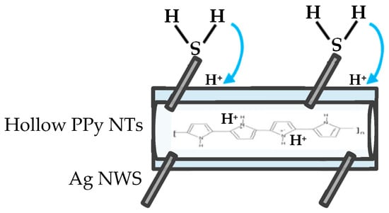Duc et al. [11], Garg et al. [16], Nerkar et al. [17] and Kriván et al. [49] proposed the H2S gas-sensing mechanism of pristine PPy film via redox reaction, which is the transfer of the protons from H2S to the PPy film. Therefore, based on the above vision, a model (shown as Figure 8) was used to describe the resistance of the H2S gas sensor based on the Ag NW/hollow PPy NT nanocomposite film that was herein reduced upon exposure to H2S gas. When the Ag NW/hollow PPy NT nanocomposite was exposed to H2S, the H2S molecules adsorbed on the Ag NW surface rather than on hollow PPy NTs, because Ag is less electronegative than C; the adsorption of H2S led to a possible dissociation of H2S to form AgS and H+; a charge (H+) transfer occurred from the Ag NWs into the hollow PPy NTs, forming Ag NW/hollow PPy NTsH+●H2S. The released protons entered the hollow PPy NTs, increasing the concentration of charge carriers and leading to an increase in the conductivity of the H2S gas sensor based on the Ag NW/hollow PPy NT nanocomposite film.