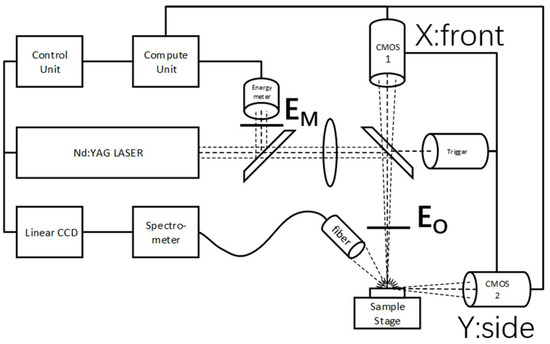 To keep the fast, convenient, and low-cost advantages of LIBS, we designed and implemented a LIBS system setup, shown in Figure 1. The Dawa 200 from Beamtech provided 200 mJ output energy with a 1064 nm wavelength, 8 ns duration, and 1 Hz repetition. The spectrometer was Ocean Optics Max 2500+ with dual channels from 230 nm to 450 nm and 0.1 nm resolution coupled with linear CCD. The spectrometer started to capture the spectrum after a one-microsecond delay of laser emission, and the integration time was 1 ms. The pulsed light emitted by the laser first passed through a 45° beam-splitter sampling mirror and reflected about 1% of the energy to the Thorlabs ES120C energy meter to record the laser energy. Most of the remaining laser light passed through an ultraviolet fused-silica focusing lens with a focal length of 150 mm, passed through a dichroic mirror, changed its direction, and entered the sample surface to excite the plasma. The diameter of the laser-focused spot on the sample surface was less than 0.1 mm, and the actual measured laser energy after passing through the dichroic mirror fluctuated from 199 mJ to 203 mJ. The sample stage was able to move in two dimensions in the focal plane. A lens set installed at the front of the optical fibre linked to the spectrometer was designed to collect the plasma emission 40 mm away from the laser focal point. Two Baumer VCXU-23M CMOS cameras were set up to capture the plasma images. CMOS 1 was perpendicular to the sample surface, which was designated as the X direction. CMOS 2 was parallel to the sample surface, which was designated as the Y direction. Both cameras were triggered synchronously with the laser via photodiodes.