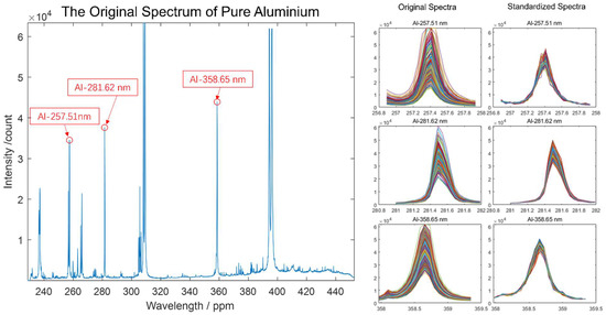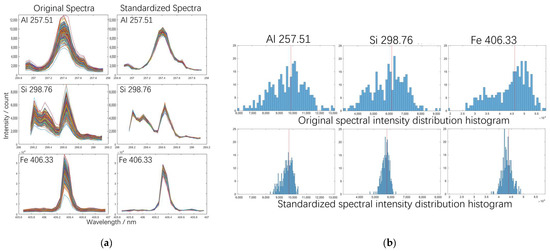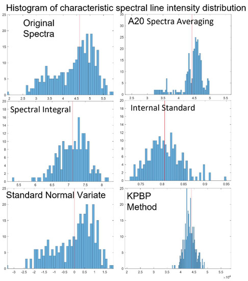 Commonly used normalization methods include normalization to the background, spectral integral normalization, standard normal variate normalization, and internal standard normalization [16]. Normalization to the background is effective in some cases but also has some dissenting voices, and our previous work did not obtain good results, so it was not used in this study [17,18]. The spectral integral method, also known as normalization to the total area, uses the intensity integral of the whole spectrum to represent the fluctuation of a single excitation, dividing the spectrum intensity by the integral value to obtain the normalized spectrum [19]. The standard normal variate method entails adjusting a set of characteristic spectral line intensities to a standard normal distribution [20,21]. The internal standard method involves selecting a reference spectral line near the characteristic spectral line to calculate the relative intensity [22,23]. These methods all use the information of the spectrum itself to normalize it, so the ability to eliminate spectral fluctuations is limited. In addition, with the internal standard method, it is sometimes difficult to find a suitable reference spectral line in quantitative analysis.