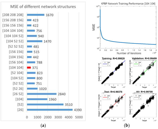 The KPBP network structure optimization result. (a) The final MSE of different network structures after 20,000 iterations. [104 104] was the best structure. (b) The training performance and the training evaluation of the best structure [104 104].