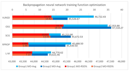 For a given problem, it is often impossible to determine what training function to use through theoretical analysis. We selected five commonly used training functions for comparative experiments: the variable learning rate backpropagation method (VLRGD), the single-step secant method (OSS) [42], the quantized conjugate gradient method (SCG) [43], the elastic backpropagation method (RPROP) [44], and the Levenberg–Marquardt algorithm (L-M) [45]. Five KPBP models named after the training functions were obtained using the same Al 358.65 nm training set, the same optimal network structure, and different training functions. In the test set of 200 spectra, the original average intensity (OR-Avg) of Al 358.65 nm was 43,045.21, and its original relative standard deviation (OR-RSD) was 21.04%. The modified average intensity of spectra (MO-Avg) and the modified relative standard deviation of spectra (MO-RSD), which were calculated by the network output from the five different models, were used to measure the optimization performance of different models. Additionally, the test set was equally divided into two groups to analyze the stability of the five different models.