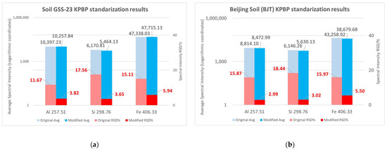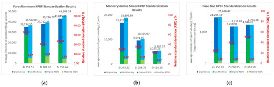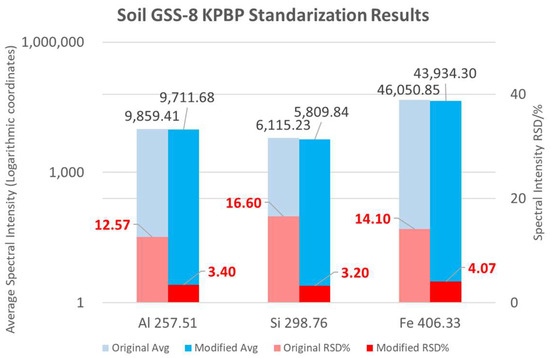 A GBW07408 (GSS-8) standard loess soil sample was selected for the KPBP experiment, and the experimental process and evaluation method were consistent with the pure aluminium experiment. Three characteristic spectral lines, Al 257.51 nm, Si 298.76 nm, and Fe 406.33 nm, were selected for KPBP standardization and analysis. The contents of the three elements in GSS-8 were Al: 6.31%, Si: 27.35%, and Fe: 4.08%. The average intensities of the three characteristic spectral lines spanned a large range, from 6115 to 46,050. As shown in Figure 8, after KPBP standardization, the RSDs of the three characteristic spectral lines all decreased to less than 5%. The changes in average spectral intensities before and after the experiment were relatively small, and the largest change was in the Fe spectral line, which was only reduced by 4.6%. While the average intensities remained stable, the repeatability of the spectra was greatly improved by the KPBP method.