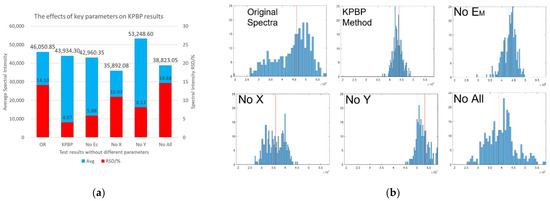 The effects of key parameters on KPBP results. (a) The average intensity and RSD of Fe 406.33 nm from the original spectra and the results of the experiments. (b) Fe 406.33 nm intensity distribution histograms of the original spectra and the results of the experiments.
