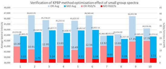 Comparing the optimization results of each group separately, all of the RSDs were greatly reduced, and most of them were mostly between 3% and 4%. Furthermore, comparing the average intensity of each group before and after the optimization shows that the fluctuation of the ten MO-Avg was smaller and the RSD of ten MO-Avg was 1.33%. This means that even if there are only 20 spectra, the optimized results of KPBP can effectively express the spectral information of Fe 406.33 nm.
