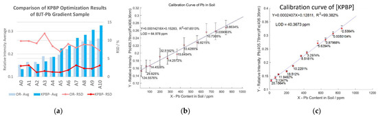 Quantitative analysis results of lead-containing gradient Beijing soil samples by the internal standard method. (a) The average relative intensity and RSD of Pb 405.78 nm from the original spectra and the KPBP results. (b) Calibration curve of lead-containing gradient Beijing soil samples calculated from the original spectra. (c) Calibration curve of lead-containing gradient Beijing soil samples calculated from the KPBP-standardized spectra.