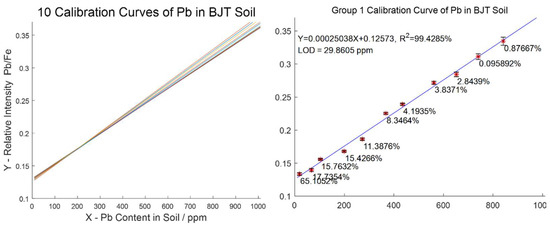 As shown in the previous experimental results, spectral data optimized by the KPBP method had a smaller RSD, which makes them excellent input for subsequent data processing methods. We used the LIBS internal standard quantitative analysis of lead in the soil to verify the superiority of the KPBP-standardized spectra.