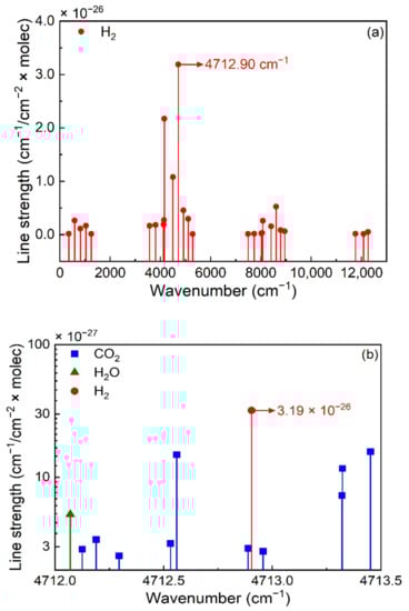 Simulations of line strength based on the HITRAN 2020 database. (a) All absorption lines of H2. (b) The absorption lines of H2, CO2, and H2O between the spectral range of 4712.0 cm−1 and 4713.5 cm−1.