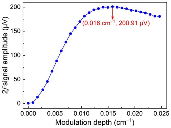 The intensity of the TDLAS 2f signal is related to the modulation amplitude of the sine wave [45]. Therefore, the relationship between the 2f signal amplitude and the modulation depth was measured when the concentration of H2 was 100%, which is depicted in Figure 4. With the increase in the modulation depth, the 2f signal amplitude increased at the beginning, flattened out, and finally slowly descended. The maximum 2f signal amplitude of 200.91 μV could be obtained when the modulation depth was 0.016 cm−1. This optimum modulation depth was kept for use in the subsequent experiments. In addition, the small value of the optimal modulation depth also proves that H2 has a narrow absorption line width compared to other gases [51,52,53,54,55,56,57].