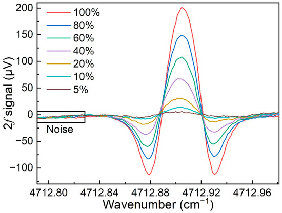 Harmonic demodulation technique is often used for the demodulation of modulated signals. In TDLAS, the magnitude of the harmonic signal is related to the strength of the gas absorption line corresponding to that wavelength [48]. Hence, the shape of the harmonic signal obtained by demodulation is theoretically a straight line for the first method, while for the second method, the shape of the harmonic signal obtained by demodulation is related to the harmonic order number. In terms of each order of harmonic, the even harmonic peak is located at the center of the absorption line, while the odd harmonic is zero at the absorption peak. With the increase in harmonic order, the harmonic peak decreases rapidly. Compared with other orders of harmonics, the peak value of the second harmonic (2f) is not only located at the absorption peak but also is the largest among even harmonics. Based on these features of harmonic signals, the 2f order is often used during the demodulation of modulated signals.