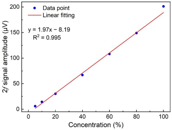 The linear fitting between the 2f signal amplitude and H2 concentration for the H2-TDLAS sensing system.
