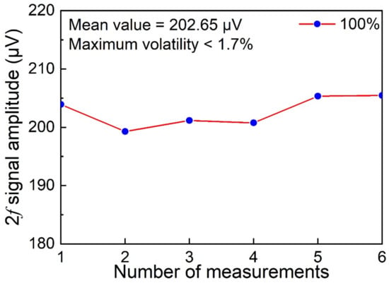 In order to evaluate the response performance of the WMS-HMPC-based H2-TDLAS sensing system, H2 with a concentration of 100% and pure nitrogen (N2) were sent into the gas dilution system, respectively, and mixed gases with H2 concentrations of 100%, 80%, 60%, 40%, 20%, 10%, and 5% were obtained by controlling the flow rate of two gas flowmeters in the dilution system. The mixed gas was sent into the gas cell at a constant flow rate of 300 mL/min. The 2f signal for the TDLAS sensor with respect to different concentrations of H2 was measured and is shown in Figure 5. The relationship between the 2f signal amplitude and the H2 concentrations is displayed in Figure 6. These data points were linearly fitted by using the equation y = 1.97x − 8.19, and the R-squared value was calculated as 0.995. Additionally, a calculation of 2f signal repeatability at 100% H2 concentration was performed and is shown in Figure 7. In the measurements that were taken 6 times, the mean value was 202.65 μV and the maximum volatility was less than 1.7%, which indicates a good performance in 2f signal’s repeatability in the H2-TDLAS sensing system.
