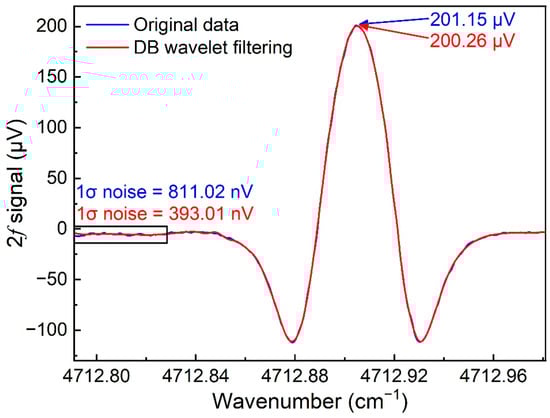 As shown in Figure 5, there was a presence of noise in the measurement of the H2-TDLAS 2f signal. Therefore, the wavelet denoising method was applied to further improve the sensor’s performance. A DB wavelet with 10 vanishing moments was employed for 2f signal denoising by 6 times. The 2f signal, with and without the DB wavelet denoising when H2 concentration was 100%, are shown in Figure 8. The data far from the absorption peak in the 2f signal were considered as the system noise. Compared to the original 2f signal, the 1σ noise deviation with the DB wavelet denoising was reduced by half while the 2f signal amplitude was almost identical. Furthermore, the SNR and minimum detection limit (MDL) improved from 248.02 and 0.40% to 509.55 and 0.20%, respectively.