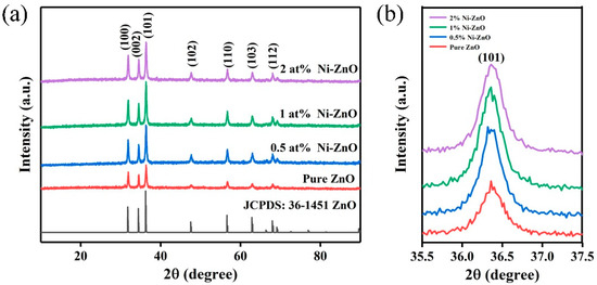The XRD pattern of the pure ZnO, 0.5, 1, and 2 at% Ni–ZnO core-shell spheres are shown in Figure 1a. The diffraction peaks appeared at 34.42°, 36.25°, 47.53°, 56.60°, 62.85°, 68.17°, 69.29°, which corresponded to the (100), (002), (101), (102), (110), (103), and (112) crystal planes of the hexagonal wurtzite phase ZnO (JCPDS No. 36-1451) [45]. However, no peak matched with Ni or NiO in the Ni–ZnO samples. No other diffraction peaks corresponding to the impurities were detected. Figure 1b is the high-resolution peak of the (101) plane of ZnO compared to pure ZnO, and the diffraction peak of Ni–ZnO shifted to a higher angle direction. The shift of 2 at% Ni–ZnO sample was the most obvious, which indicated that Ni2+ was incorporated in the ZnO crystal lattice due to the radius of Ni2+ being smaller than Zn2+.