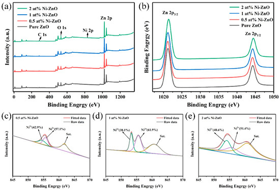 The XPS measurement was used to analyze the chemical composition and states of the elements in the pure ZnO and Ni–ZnO samples. Figure 5a exhibits the full spectrum of the ZnO and Ni–ZnO samples, where the full spectrum contained the peaks of Zn, O and Ni, proving the presence of Zn, O, and Ni in the sample. In Figure 5b, the binding energy around 1021.20 and 1044.28 eV corresponded to Zn 2p3/2 and Zn 2p1/2, respectively, proving that Zn was in the form of Zn2+ [49]. Figure 5c–e shows that the Ni 2p3/2 orbital can be separated into three peaks of about 854.1, 856.3, and 861.2 eV, corresponding to the Ni2+, Ni3+ and satellite peaks, respectively [50], indicating the existence of Ni ions in the ZnO crystals.