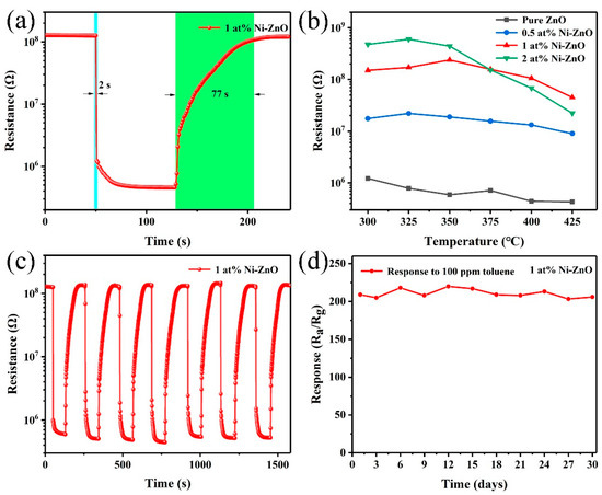 Figure 9c is a seven-cycle test curve of the 1 at% Ni–ZnO sample to 100 ppm toluene at 325 °C. The resistance in air and toluene was within the allowable fluctuation range, proving that the sensor had good repeatability. The long-term stability was also studied in this work; the sensing response to 100 ppm toluene in the air for one month is shown in Figure 9d. During the test days, the response values varied and slightly decreased but did not show an obvious fluctuation. The results indicate that the 1 at% Ni–ZnO gas sensor has good long-term stability.