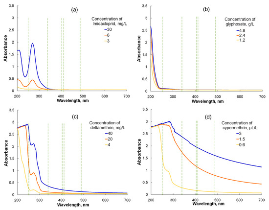 Absorption spectra of commercial pesticide formulations as dependent on concentrations of their active ingredients: (a) Confidor Extra water solution (active ingredient—imidacloprid), (b) Liquidator water solution (active ingredient—glyphosate), (c) Delcid ethanol solution (active ingredient—deltamethrin), and (d) Briz acetonitrile solution (active ingredient—cypermethrin). Vertical dotted lines indicate the absorbance of the pesticide solutions at the wavelengths used in the chemoenzymatic analysis.