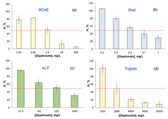 The effect of the Tornado Extra commercial pesticide formulation (with glyphosate as the active ingredient) on single-enzyme assay systems: (a) BChE, (b) Red, (c) ALP, and (d) trypsin.