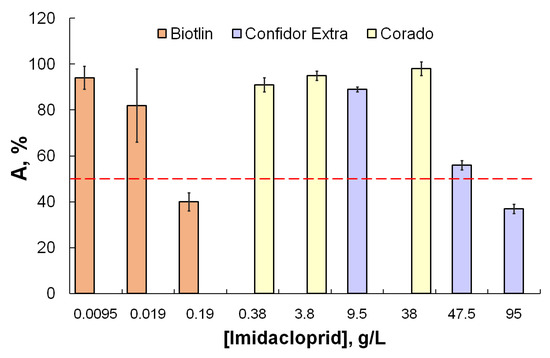 BChE activity vs. concentration of imidacloprid as the active ingredient of the commercial pesticide formulations Biotlin, Corado, and Confidor Extra.
