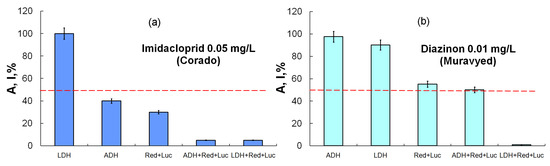 The sensitivity of the assay systems to toxic substances became considerably higher as the length of the chain of conjugated enzyme reactions was increased from the single-enzyme to three-enzyme reactions. For instance, the sensitivity of the three-enzyme LDH + Red + Luc and ADH + Red + Luc systems exposed to imidacloprid (the active ingredient of the Corado formulation) at a concentration of 0.05 mg/L was 20 times higher than the sensitivity of the single-enzyme LDH system (Figure 4). The IC50 value for diazinon (the active ingredient of Muravyed) was 0.05 mg/L for the single-enzyme LDH system and 0.005 mg/L for the three-enzyme LDH + Red + Luc system (Table 3). The three-enzyme ADH + Red + Luc system showed the highest sensitivity to the effects of most of the tested commercial formulations. The neonicotinoid pesticide imidacloprid produced the strongest inhibitory effect on this assay system: the luminescence intensity of the three-enzyme ADH + Red + Luc system was reduced by a factor of two when exposed to the Biotlin and Corado formulations at concentrations that were several orders of magnitude below the MRL of imidacloprid in food.