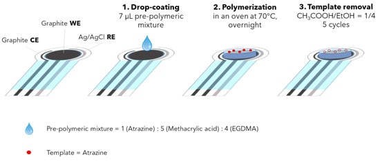 Each screen-printed cell (SPC) was washed with ethanol and left to dry at room temperature under a hood. A small volume of the prepolymeric mixture (7 µL MIP or NIP mixture) was drop-coated on the cleaned surface of the working electrode. After drop coating, the screen-printed cell was placed in a vacuum desiccator before the subsequent thermal polymerization to avoid oxygen absorption. Then, the thermal polymerization was carried out in a thermostatic oven at 70 °C overnight.