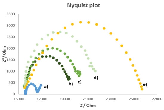 Nyquist plot of (a) bare electrode, (b) MIP-modified electrode, (c) MIP-modified electrode charged with 10−6 M atrazine, (d) MIP-modified electrode charged with 7.7 × 10−6 M atrazine, (e) NIP-modified electrode. Measurements performed in 5 mM K3Fe(CN)6/0.1 M KCl solution; frequency range 100 kHz ÷ 10 mHz; signal amplitude = 50 mV.
