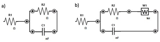 All phenomena at the MIP- and NIP- modified electrodes (a) and at the bare electrode (b) may be schematized with the Randles circuits shown in Figure 3. R1 corresponds to the solution resistance, R2 is the electron transfer resistance (i.e., the diameter of the semicircle in the Nyquist plot), C1 is the double-layer capacitance, and Zw is the Warburg impedance which is due to the mass diffusion-limited process.