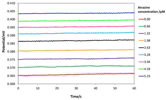 Measurements were performed by immersing the screen-printed cell in 15 mL of the acid solution, gently stirring. At each addition of a standard atrazine solution, the potential was registered and reported as the average of the values sampled in the last 60 s after waiting for the steady state (stability criterium ΔE/Δt = 0.05 mV/s). It was verified that the steady state could be reached in 5 min (See Figure S5 in Supplementary Materials), which is a relatively long time, and it is probably due to the slow diffusion of atrazine across the MIP layer. As an example, Figure 5 shows the potentiometric response of a MIP-based screen-printed cell at different atrazine concentrations.