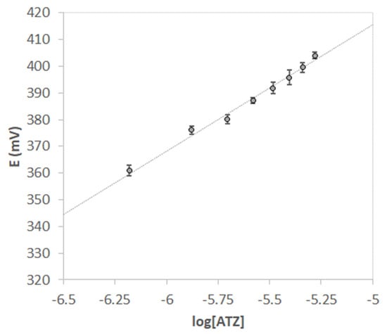 Nernst’s plot E vs. log [ATZ]. V = 15 mL of HCl pH = 1.5. Each point is the mean of 5 measurements obtained with different screen-printed cells. Error bars correspond to the standard deviation of the measurements.