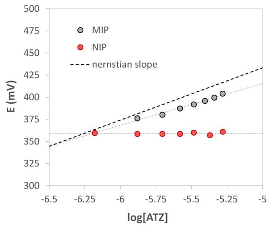Nernst’s plot E vs. log [ATZ]. V = 15 mL of HCl pH = 1.5. grey bullets MIP, red bullets NIP. The dotted black line represents the theoretical Nernstian slope for monovalent cation.