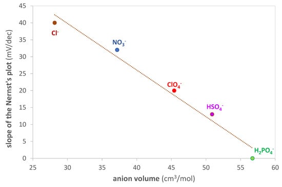 Slope of the Nernst’s plot (mV/dec) vs. anion volume (cm3/mol) of the inorganic acids used as the ionic medium. Anion volume computed with Gaussian 6.0 software [].