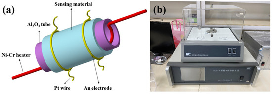 The associated characterization tests were all consistent with our previous work [37]. The N2 adsorption–desorption measurements were performed (MicroActive 5.02), and the specific surface area was calculated using the Brunauer–Emmett–Teller (BET) equation. The fabrication of the sensor was based on an Al2O3 ceramic tube with parallel Au electrodes and Pt wires (Figure 1a). There was a Ni-Cr alloy in the tube as a heater, which was convenient for controlling the operating temperature. The obtained NiO powder was dispersed in ethanol and ultrasonically treated to obtain a slurry. The slurry was then coated on Al2O3 tubes, dried at 100 °C, and annealed at 350 °C for 1 h. The fabricated sensor was welded to the test cavity and aged at 200 °C. The sensitive performance of the sensor was tested using an intelligent gas-sensing test system (CGS-8 Beijing Ailite) (As shown in Figure 1b). The gas distribution system evaporated the target gas with a specific concentration in the reaction chamber. After the gas concentration was stable, the gas sensing performance was tested. The humidity of the chamber was controlled by simultaneously adjusting the flow rates of dry air and air moistened with pure water at room temperature. The gas response in this paper was defined as the ratio of the sensor’s air resistance to the target gas resistance, ie Rg/Ra. All of the tests were performed in an environment with a humidity of 30%.