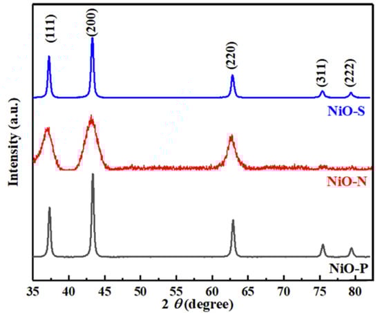 X-ray diffraction (XRD) (PANalytical B.V., Almelo, The Netherlands) was used to determine the crystal structure of the samples. Figure 2 shows the XRD pattern of NiO-P, NiO-N, and NiO-S. The diffraction patterns of the three kinds of NiO showed no peaks related to other compounds except NiO. It meant that the obtained samples were pure NiO. All of their diffraction peaks matched the standard card (PDF#47-1049), and these peaks correspond to the (111), (200), (220), (311), and (222) planes of NiO. It could be seen that the noise of the NiO-N diffraction pattern was relatively large, and the peaks corresponding to the (311) and (222) crystal planes were inconspicuous because the crystallinity of this sample was poor. On the other hand, the peaks of NiO-P and NiO-S were sharp, indicating good crystallinity.