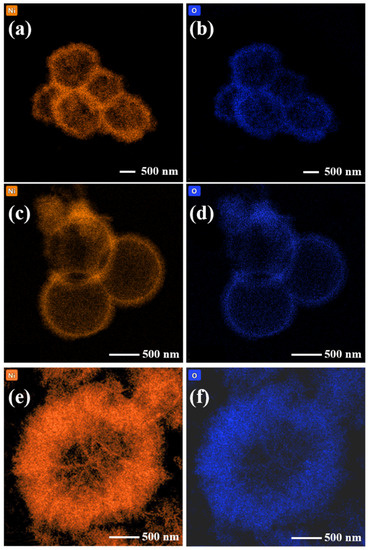 A transmission electron microscope (TEM)) (ThermoFisher Scientific, Waltham, MA, U.S.) was used to further analyze the microscopic morphology of the NiO hollow spheres. As shown in Figure 4a,b, the NiO-P was indeed composed of a large number of particles, and the walls of the hollow spheres were thicker. From Figure 4c,d, it could be seen that the surface of NiO-N was not smooth but consisted of upright nanoneedles with thin hollow sphere walls. The NiO-S hollow spheres composed of nanosheets had the thickest walls and the smallest hollow cavities, as shown in Figure 4e,f. To study the elemental distribution of the samples, we tested their EDS pattern. Figure 5 depicts the energy dispersive spectrometer (EDS) pattern of (a,b) NiO-P, (c,d) NiO-N, and (e,f) NiO-S. The pattern showed that Ni and O elements were highly uniformly distributed.