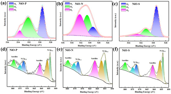 The O 1s XPS spectra of (a) NiO-P, (b) NiO-N, (c) NiO-S; the Ni 2p XPS spectra of (d) NiO-P, (e) NiO-N, (f) NiO-S.