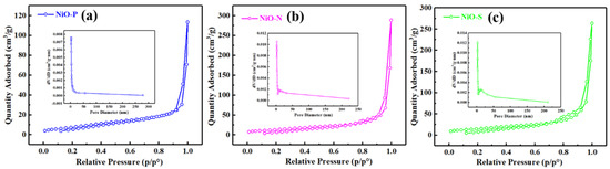 To further investigate the specific surface area and porosity of the samples, N2 adsorption-desorption tests were performed. Figure 7 shows the N2 adsorption and desorption isotherms and pore-size distribution curves (insert) of NiO-P, (b) NiO-N, and NiO-S. From the figure, we could see that all three samples showed type IV in IUPAC type with H3 hysteresis loop. By calculation, the specific surface areas of NiO-P, NiO-N, and NiO-S were 29.75 m2/g, 49.35 m2/g, and 55.2 m2/g, respectively. The relevant data on the specific surface area, mesopore volume, and the average pore size are presented in Table 4. However, we could notice that NiO-N with the largest pore volume and average pore size did not obtain the largest specific surface area. This might be because the two-dimensional structure of NiO-S enabled it to obtain a larger surface area than the other two materials. The high specific area increased the adsorption sites for oxygen and ethanol molecules, making the material more responsive. Therefore, the NiO-S with the largest specific surface area might possess the largest ethanol response.