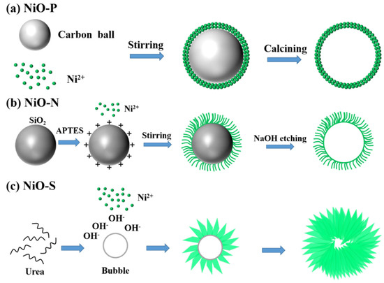 Schematic diagram of the formation process of (a) NiO-P, (b) NiO-N, (c) NiO-S.