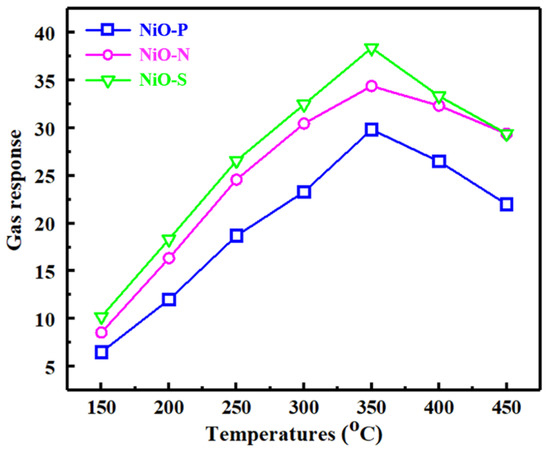 Temperature is extremely important for gas detection. The occurrence of the gas-sensing reaction requires additional energy to promote, and thermal energy is used as the energy. Figure 9 shows the gas response of different NiO sensors to 200 ppm of ethanol at 150~450 °C. All three sensors exhibited a classic “volcano-like” curve. From 150 to 350 °C, the gas response increased gradually with the increase in temperature. At 350 °C, the gas response hit the top, indicating that 350 °C was the optimal working temperature of the NiO hollow sphere sensors. At this time, the gas responses of NiO-P, NiO-N, and NiO-S to 100 ppm ethanol were 29.8, 34.4, and 38.4, respectively. When the temperature exceeded 350 °C, the gas response decreased gradually. This trend of rising first and then falling was because, in the low-temperature region, the increased temperature provided more energy to promote the reaction, while in the high-temperature region, the temperature simultaneously promoted the desorption of gas molecules, which reduced the gas response. From the figure, we could draw the conclusion that the NiO hollow spheres assembled from nanosheets had the largest gas response.