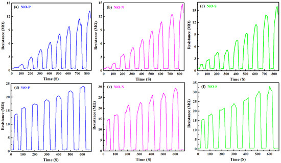 Dynamic response curves of NiO-P, NiO-N, and NiO-S in the range of ethanol concentration from (a–c) 10 to 90 ppm; (d–f) 100 to 700 ppm.