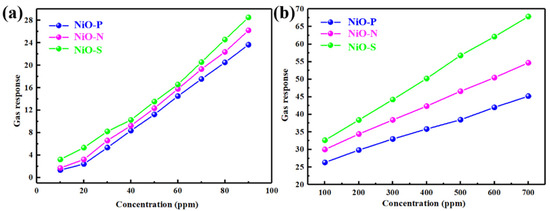 Figure 10 shows the dynamic response curves of NiO-P, NiO-N, and NiO-S in (a–c) the range of ethanol concentration from 10 to 90 ppm and (d–f) 100 to 700 ppm. All of the samples showed good response/recovery characteristics, with short response/recovery times. It was the fast detection of ethanol and resistance back to baseline. Figure 11 shows the gas response of NiO at 350 °C as a function of the concentration range of 10~90 ppm and the concentration range of 100~700 ppm. It could be observed that the gas sensors based on three NiO hollow spheres exhibited the gas-sensing behavior of classical p-type semiconductors. As the ethanol concentration increased, the responses of all of the samples increased. In the region of high ethanol concentration, the relationship between concentration and gas response was almost linear. Compared with NiO-P and NiO-N, the NiO-S assembled nanosheets exhibited a significantly higher gas response, consistent with Figure 9. The gas response also did not flatten out when the ethanol concentration was 700 ppm. Furthermore, there was still a clear response at 10 ppm ethanol concentration. This showed that the gas sensor of the NiO hollow spheres had a wide working range, which was beneficial to the application of the sensors in various scenarios.
